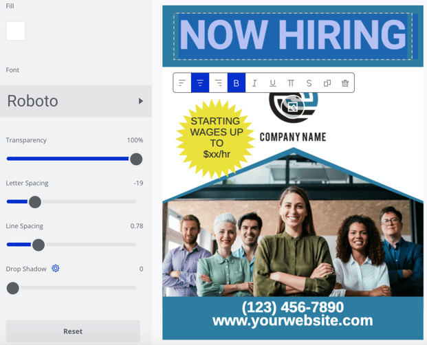 - Now, after selecting the template that fits your brand best, it is time to customize it. This is where you will add your company’s specific details – location, contact info, logo, slogan, and any extra details you would like on your postcard. This customization process is as easy and straightforward as it gets. Simply, click on the image, section, or text you would like to edit and you'll be able to adjust it. Check out this video for an in-depth tutorial on how to customize your template!