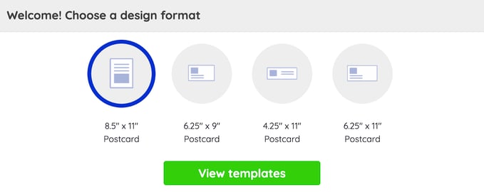 - When you first enter our online design tool, you’ll be prompted to choose your postcard design format. There are four postcard options: 8’’ x 11’’, 6.25’’ x 9’’, 4.24’’ x 11’’, and 6.25’’ x 11’’. If you’re curious about which of the four options is best for your business, check out this blog post for the ultimate direct mail sizes and dimensions guide.
